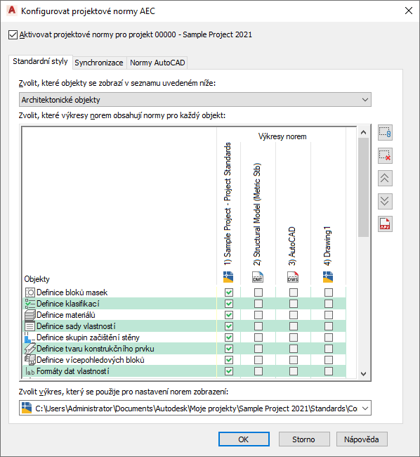 Pro nastavení stylů norem a nastavení zobrazení definujte jeden nebo více výkresů projektových norem, které obsahují normy pro styly a nastavení zobrazení. Tyto výkresy mohou být typu DWG, DWT nebo DWS a jsou přidány do dialogu konfigurace.