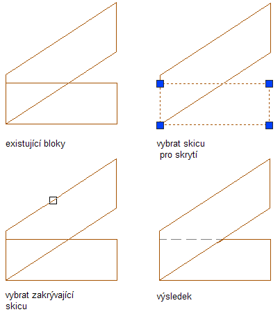 Tento postup se používá k zakrytí („schování“) části skici na rozdíl od jiných částí skici. Tato funkce je užitečná hlavně v případech, kdy chcete naznačit, že jedna entita pokračuje za nebo poblíž jiné entity, kterou chcete zobrazit v popředí. Zakrytá část skici se umístí na hladinu specifikovanou klíčem hladiny SKRYTÁ (HIDDEN). Jakmile vyvoláte povel Zakrýt, můžete také specifikovat dva rohy obdélníku, který se použije.