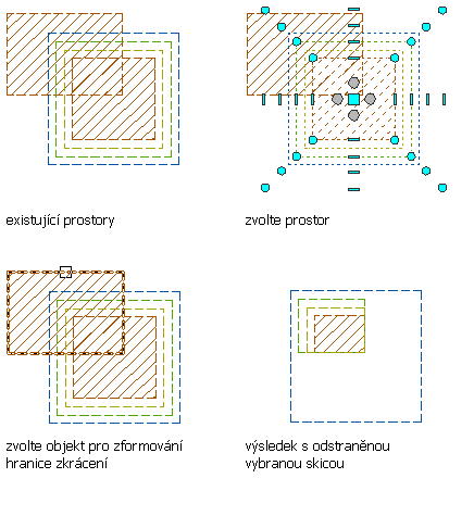 Tento postup slouží k vytvoření nového vysunutého 3D prostoru z překrývající části 2 protínajících se vysunutých 3D prostorů. Můžete zvolit, zda má být po vytvoření nového prostoru ponechána ve výkresu původní geometrie.