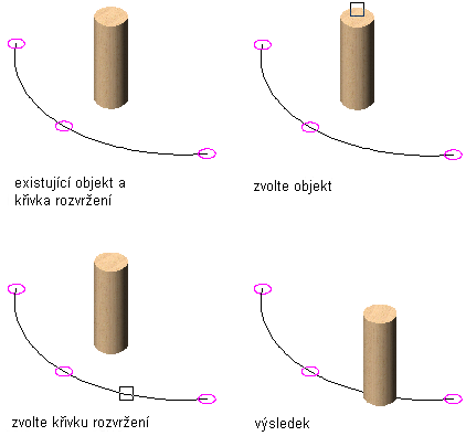 Nástroje parametrického rozvržení a ukotvení. Objekt je ukotven ke křivce v pozici X. Při prvním umístění objektu jsou pozice Y a Z rovny 0.