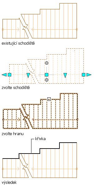 Tento postup použijte k vytvoření křivky z hrany schodiště. Křivka se vytvoří v dolním pohledu schodiště.