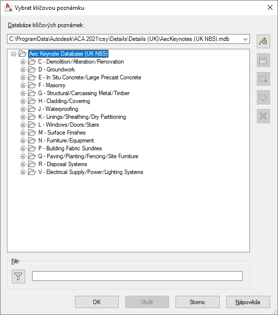 Databázi klíčové poznámky vyberte v dialogu nahoře. Databáze klíčových poznámek AEC je výchozí pro detaily komponent, zatímco databáze AecKeynote-Assemblies je výchozí pro architektonické objekty, které jsou spojením více komponent.