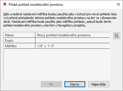 | zadat popis nového pohledu modelového prostoru | klikněte na nastavení pro Popis a přidejte popis k pohledu modelového prostoru. |