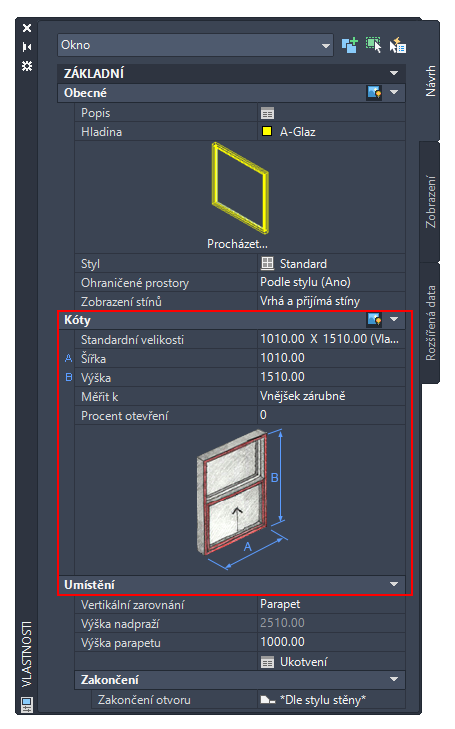 | šířku panelu rohového okna ukotveného ke stěně | zadejte hodnotu pro šířku 1 nebo pomocí nástroje Označit vyberte dva body, kterými určíte vzdálenost. |
