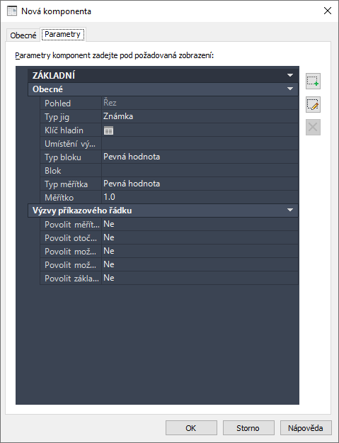 Tento postup slouží k úpravám vlastností jednotlivých komponent v rámci databáze komponent detailů. Vlastnosti na kartách Obecné a Parametry v dialogovém okně Vlastnosti komponenty představují základ pro jednu nebo více metod (recipe), které software používá ke kreslení komponent v různých pohledech. Každá metoda (recipe) určuje typ jig nebo postup při kreslení pro umístění komponenty ve specifickém pohledu. Metoda může obsahovat také informace týkající se hladiny a vzoru šrafování. Tento postup je také možné použít pro úpravy komponent ve výchozí britské a metrické databázi komponent detailů dodané se softwarem nebo k úpravám komponent v databázích, které vytvoříte.