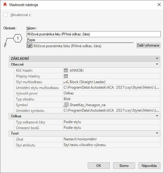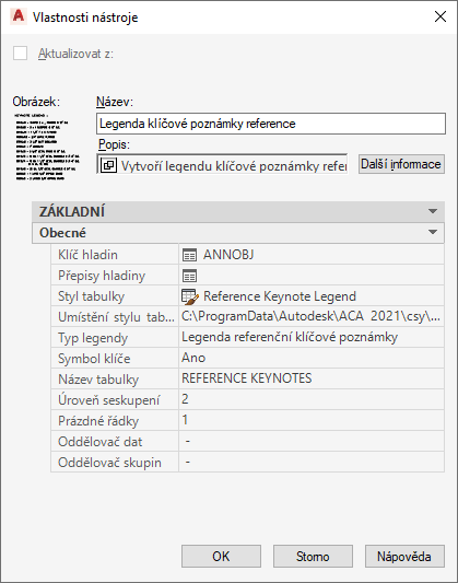| Styl tabulky | Upřesňuje styl tabulky AutoCAD legendy klíčové poznámky. Možnými hodnotami jsou Legenda klíčové poznámky reference, Legenda klíčové poznámky listu a Standard. Pokud je tato vlastnost nespecifikovaná (--), je ve výkresu použit aktuální styl tabulky. |