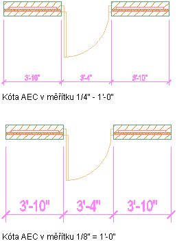 Na následující ilustraci je uvedena kóta AEC zobrazená ve dvou různých měřítkách poznámek. Kóta ARC byla vytvořena ve výkresu v prvním měřítku poznámek a poté bylo měřítko poznámek změněno.