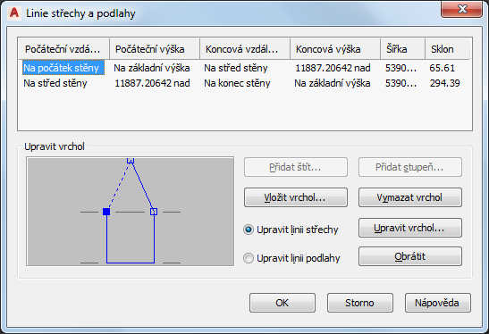 Tabulka v horní části dialogového okna zobrazuje informace o každém vrcholu v obvodovém plášti. Můžete také v seznamu vybrat vrchol, určený k úpravám.