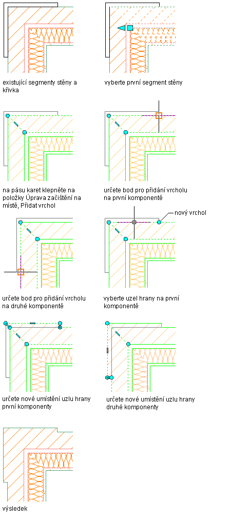 V následujícím příkladu jsou ke komponentám přidány nové vrcholy, a poté jsou uzly Hrana použity ke změně rohové podmínky cihlového obkladu.