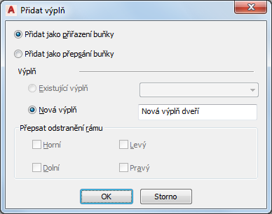 | Přidáte-li jako Přepsání buňky, můžete poté vložit dveře, okno nebo sestavu dveře/okno odlišného stylu, než jaký existuje ve výkresu a neodstranit hranu rámu, obklopujícího objekt. | vyberte možnost Nová výplň, zadejte název objektu a klikněte na tlačítko OK. |