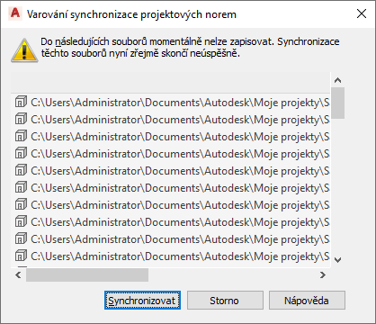 Při synchronizaci celého projektu budou výkresy, které jsou současně otevřené jiným uživatelem, nebo určeny pouze ke čtení vyloučeny ze synchronizace. Před započetím synchronizace projektu program spustí interní kontrolu pro zjištění, zda jsou v něm obsaženy výkresy, které nemohou být nyní synchronizovány. Pokud jsou takové výkresy nalezeny, zobrazí se tabulka upozornění.