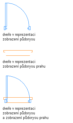 Reprezentace půdorysu a půdorysu prahu jsou používány k zobrazení dveří a to samostatně a společně.