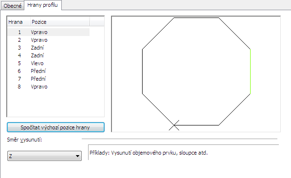 Při vytvoření profilu jsou všechny hrany označeny pro vysunutí ve směru Z. Tyto pozice hran jsou vypočteny na základě kvadrantu, do něhož spadá polovina hrany. Směr pohledu hran a směr vysunutí můžete změnit v definici profilu.