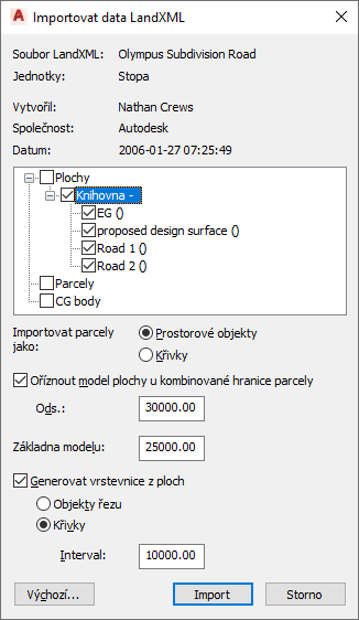 - V dialogu Importovat data LandXML vyberte možnosti importu.