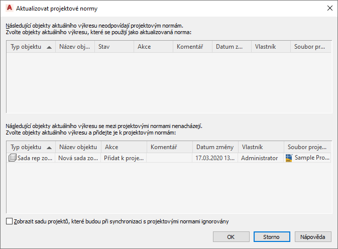 V tomto případě nestandardizované nastavení zobrazení nebude v příštích aktualizacích znovu uvedeno, pokud nenastavíte položku Zobrazit objekty, které budou při synchronizaci s projektovými normami ignorovány nebo neodstraníte příznak Ignorovat z nastavení zobrazení ve Správci zobrazení.