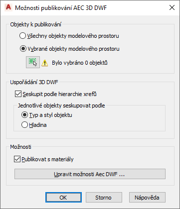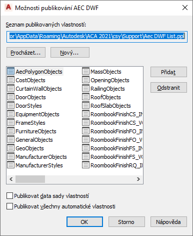 Tím budou publikovány všechny automatické vlastnosti spojené s objekty vybranými pro export do souboru DWF nebo DWFx.
