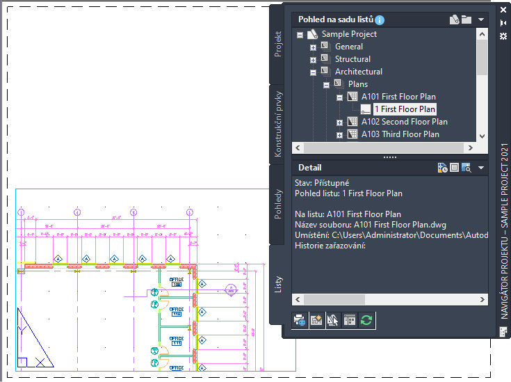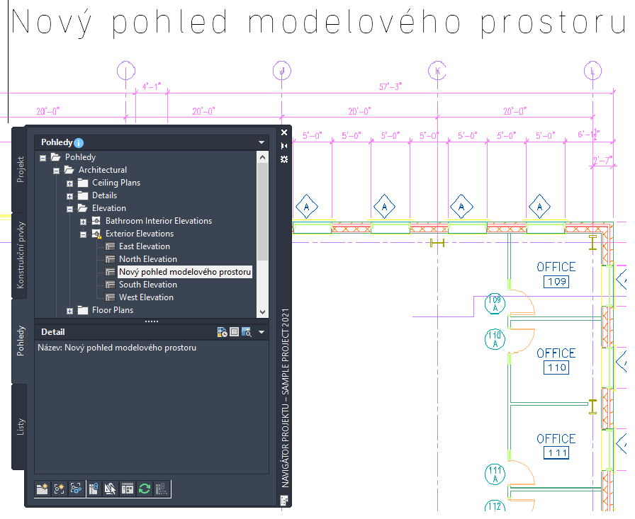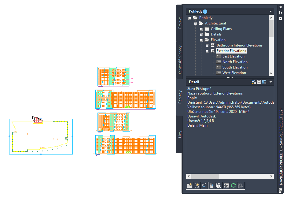 Výkres pohledu se vytváří výběrem konstrukčních prvků na paletě Navigátoru projektu a vytvořením reference na tyto prvky ve výkresu pohledu. Pokud vytváříte pohledy s více hladinami, každý konstrukční prvek je odkazován ve své relativní výšce hladiny, kdy nejnižší hladina je vložena na Z = 0.