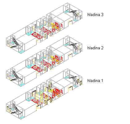 3D pohled na zkopírovaný konstrukční prvek jádra na jednotlivých hladinách budovy