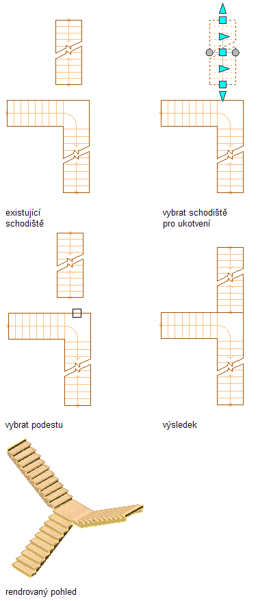 - Nakreslit schodiště s podestou a nakreslit druhé schodiště k připojení na podestu.
