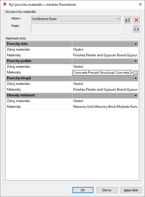 Modul Roombook obsahuje sadu předdefinovaných stylů materiálů povrchu, které lze načíst do výkresu. Styly materiálů povrchu lze upravit, uložit, kopírovat, odstranit, importovat nebo exportovat.