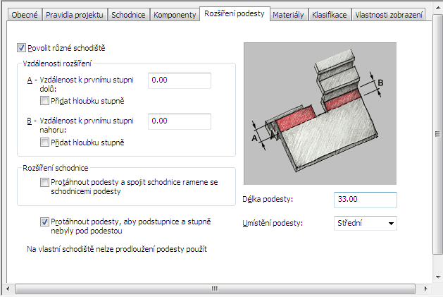 | zvětšit vzdálenost k prvnímu stupni na horní straně podesty | zadat hodnotu pro Vzdálenost k prvnímu stupni NAHORU. K rozšíření podesty nahoru o jeden stupeň, vybrat pole Přidat hloubku stupně. |