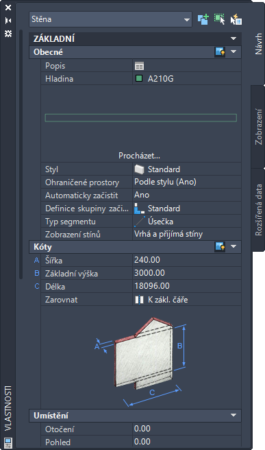 Paleta Vlastnosti pro standardní objekt stěny