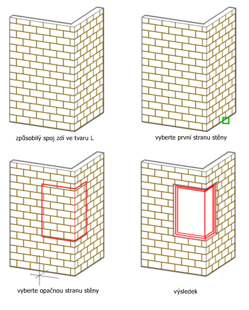 | rohové okno ve stěně | Vyberte kvalifikovaný spoj stěny tvaru L. Zadejte bod vložení podél druhé stěny. |