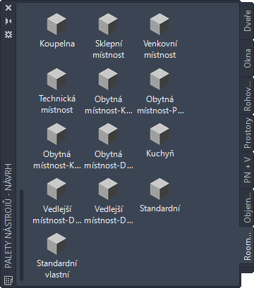 Paleta nástrojů Roombook obsahuje různé styly materiálu povrchu. Příkazy jsou propojeny se souborem