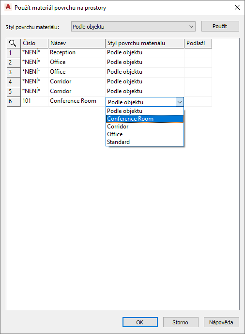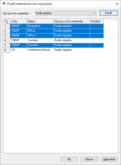 Všechny prostory výkresu jsou uvedeny v dialogu spolu s informacemi o jejich číslu, názvu a podlaží. Upravit lze pouze informace o stylu materiálu povrchu.