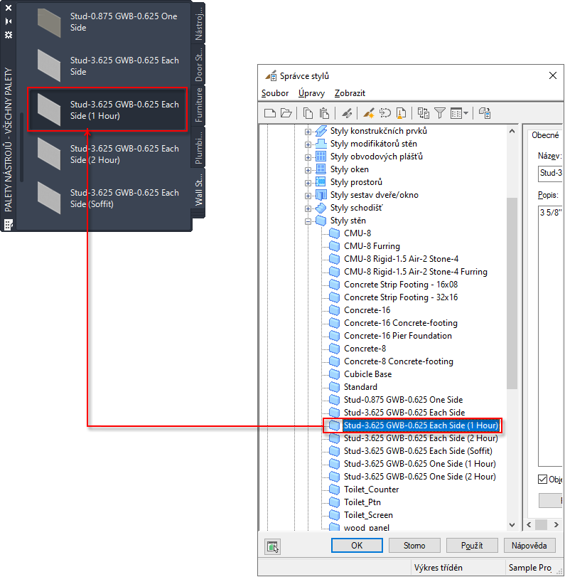 . Pokud chcete například vytvořit nástroj stěny se stylem Hrázděná-3,625 sádrokartón-0,625 každá strana (1 hodina), rozbalte položku Styly stěn a vyberte styl Hrázděná-3,625 sádrokartón-0,625 každá strana (1 hodina).