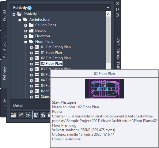 | zobrazit okno Náhled nebo Detail ve spodní části palety Navigátoru projektu | zvolte možnost Okno náhledu/detailu. |