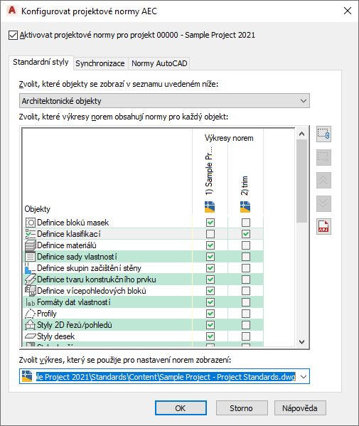 Když je projekt nebo projektový výkres synchronizován s jeho normami, jeho styly a nastavení zobrazení jsou porovnány s projektovými normami, aby byly nalezeny nesrovnalosti verzí mezi nimi a jejich následnou opravu.