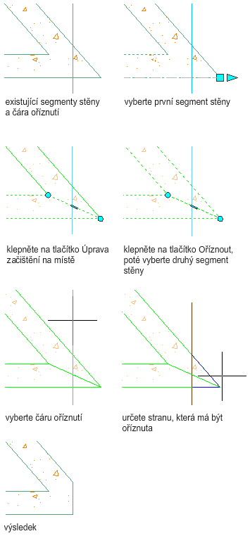 Tento postup slouží ke změně průsečíku stěny pomocí oříznutí komponenty. Hranicí oříznutí může být úsečka, oblouk, kružnice, křivka nebo hrana komponenty stěny.