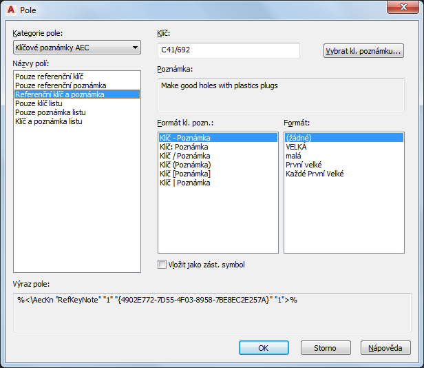 | vložit pole klíčové poznámky do prvku textu | viz část Vkládání polí do textu aplikace AutoCAD. |