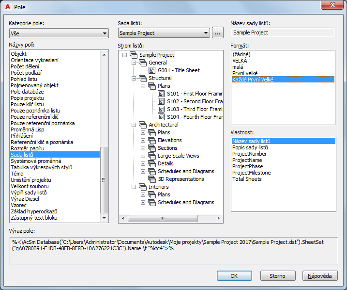 | vložit pole sady listů do definice atributu | viz část Vkládání polí do atributů aplikace AutoCAD. |