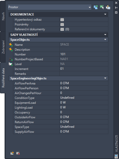 Otevřít výkres. Tato sada vlastností sestává ze stylů SpaceEngineeringObjects, ThermalProperties a ZoneEngineeringObjects.