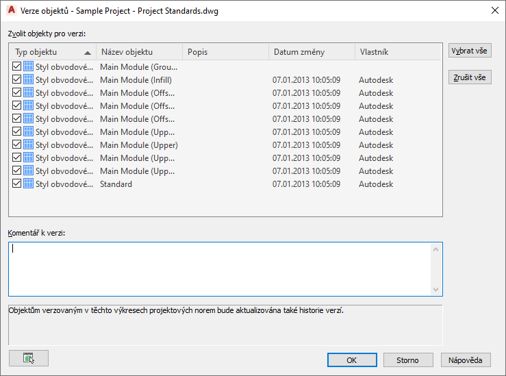 Komentář bude použit pro všechny objekty, vybrané pro přiřazení verzí.