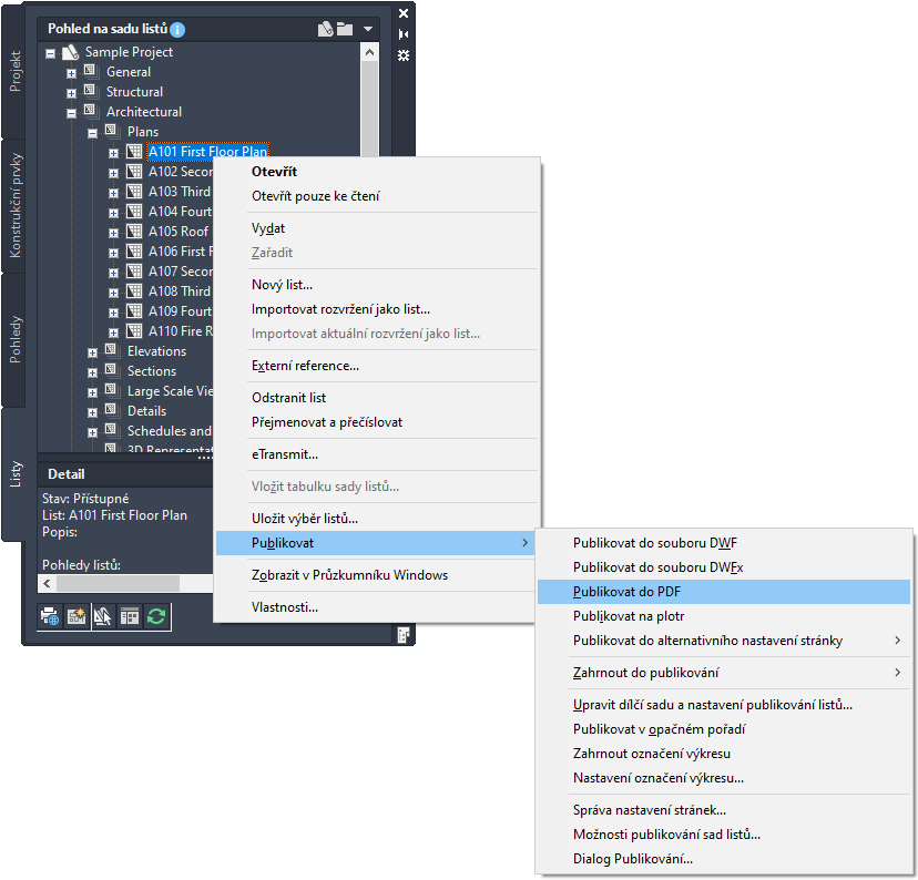 V Pohledu sady listů můžete publikovat listy na plotr, do souboru PDF, DWF nebo DWFx. K sadě listů můžete přiřadit označení výkresu, publikovat listy do alternativního nastavení stránky a zadávat nastavení pro publikování ve formátu PDF, DWF a DWFx.
