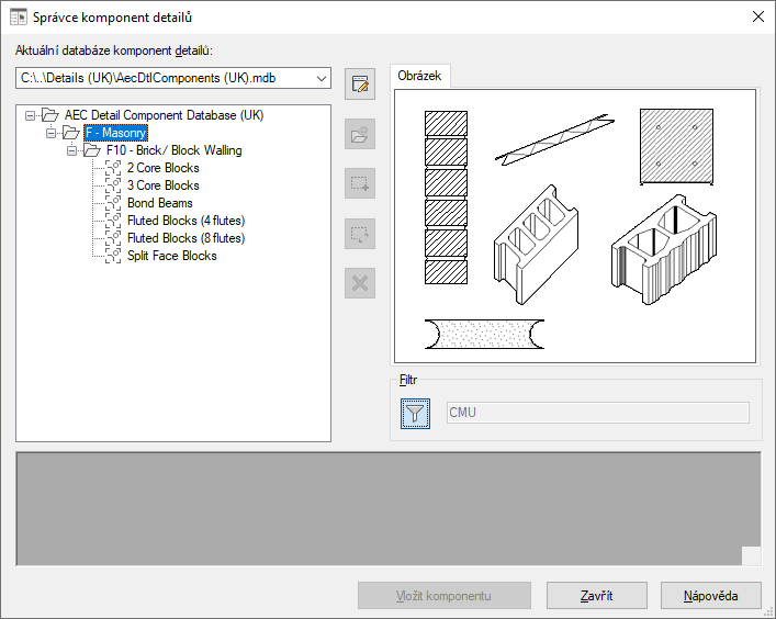 - Pro aktuální databázi komponent detailů vyberte databázi v rozevíracím seznamu. Databáze dodaná se softwarem je databáze komponent detailů AEC (AecDtlComponents(US).mdb), která je založena na standardu MasterFormat 2004 institutu CSI. Můžete také otevřít jiné místně instalované databáze.