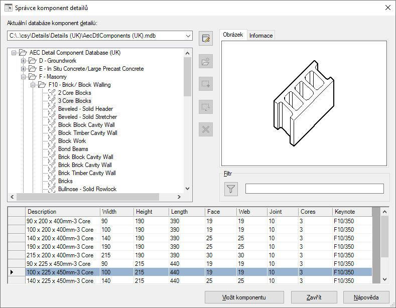 Dialog Správce komponent detailů se zobrazenou tabulkou betonového zdiva