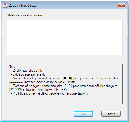 - V dialogu Zadat klíčové řazení zadejte klíčové řazení masky pro každý vzor klíče ve vybrané databázi. Použijte odlišnou čáru pro každou masku.
