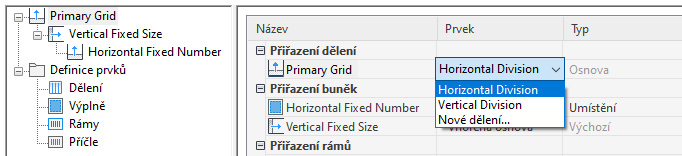 - Klikněte na sloupec Prvek u příslušné osnovy a v seznamu vyberte definici dělení.
