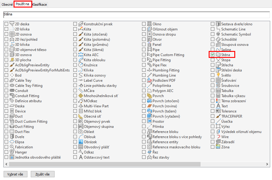 Aplikace Sada nástrojů AutoCAD Architecture 2027 podporuje definice klasifikací, které umožňují klasifikaci stylů a objektů. Procesy importu a exportu souboru IFC podporují tyto klasifikace přiřazené ke stylu a objektům.