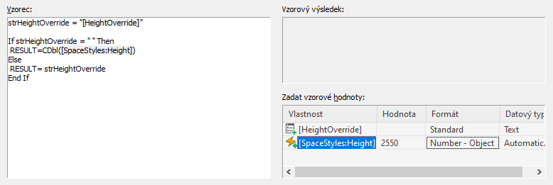 Vzorové hodnoty jsou formátovány a vloženy do vzorce namísto názvů definice odpovídající vlastnosti v závorkách. Celý vzorový vzorec je vyhodnocen a výsledek je zobrazen v podokně Vzorový výsledek.