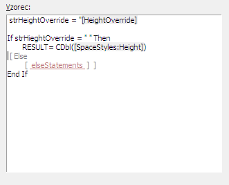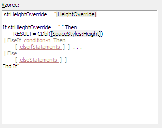 Po přidání kódu VBScript do vzorce lze vložit červený nebo šedý text pro pomoc s vytvořením vzorce. Červená označuje pole, kam je nutno přidat další kód. Pokud chcete odstranit červené pole, vyberte je a zadejte text, vložte definici vlastnosti nebo vložte jiný kód VBScript.