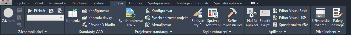 Na kartě Správa naleznete funkce pro pokročilé uživatele a správce CAD.
