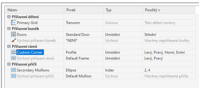 Po vytvoření definic prvků pro styl sestavy dveře/okno, můžete přiřadit tyto definice ke každému typu prvku sestavy dveře/okno: dělení, výplně buňky, rámy a příčle.