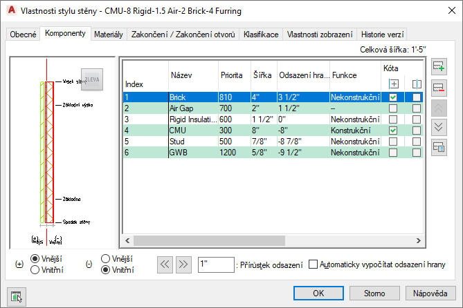 - Všem komponentám stěny by měly být přiřazeny materiály.