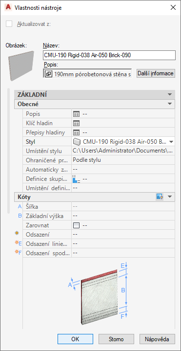 - Zobrazení půdorysu komponent stěny by normálně mělo být nastaveno tak, aby se bralo v úvahu výchozí nastavení výkresu. Nejlepší postup spočívá v přiřazování materiálů komponentám stěny a nastavení jejich skic a parametrů vzoru šrafování Dle materiálu v nastavení zobrazení půdorysu.