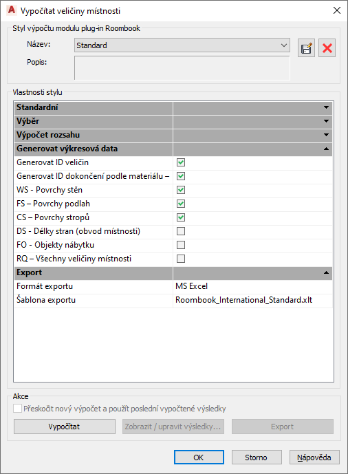 - V dialogu Vypočítat veličiny místnosti zapněte následující možnosti: